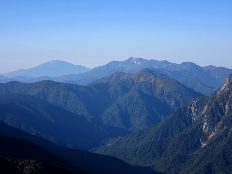 御嶽山と乗鞍岳 左奥が御嶽山。中央奥が乗鞍岳です。 そういえば御嶽山が大噴火して多数の犠牲者を出したのが3年前の明日・9月27日だったのですね。 |