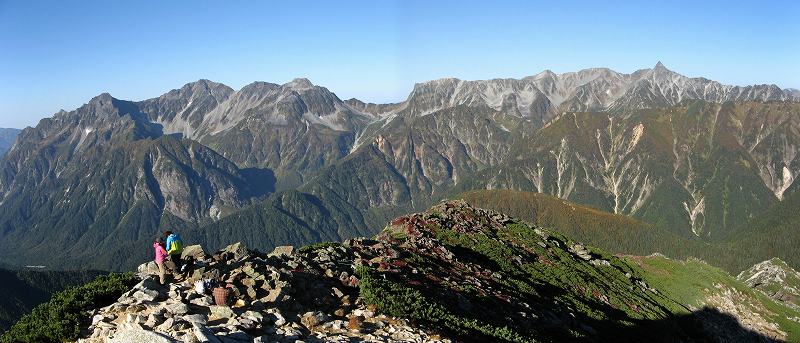 西側、穂高連峰から槍ヶ岳までのパノラマ 常念岳山頂から見た穂高連峰から槍ヶ岳までのパノラマです。 この景色は見事というほか表現が見つかりません。 登ってきた女性が、『生きていてよかったー!』 といっていましたが、その通りですね。 |