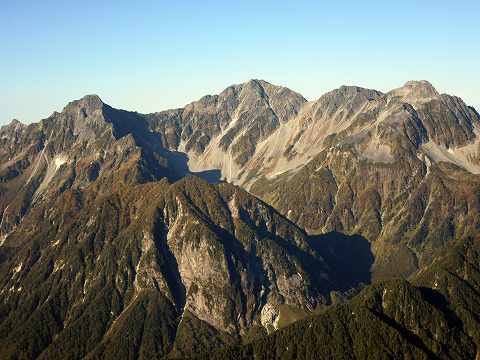 前穂、奥穂、涸沢、そして北穂 穂高連山をズームアップした姿です。 左から前穂高岳、吊り尾根を経て奥穂高岳、涸沢岳、そして北穂高岳です。 |