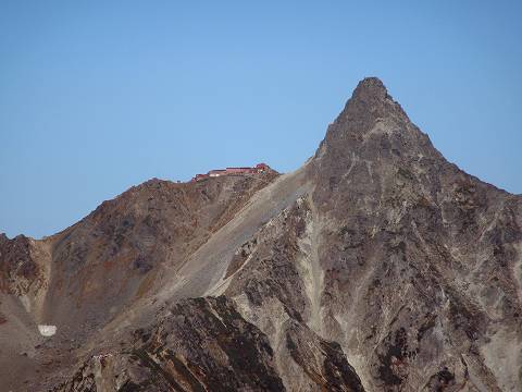 槍ヶ岳 ついでに槍ヶ岳もアップしましょう。 槍ヶ岳山荘も見えますね。 |