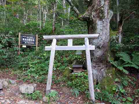 山道を登っていくと、 太いトチの木が鳥居の後ろにある山ノ神が祀られたところに出ます。 登山の安全を願ってお参りします。 〔山ノ神=8:30~8:35〕 |