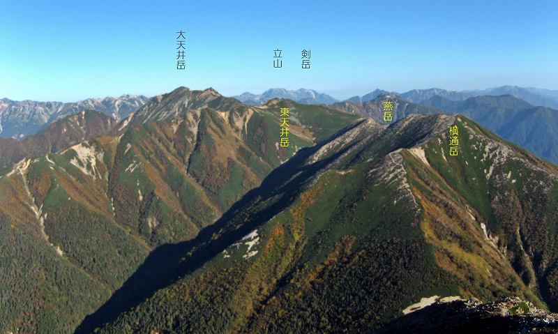 北側のパノラマ 北側には大天井岳から燕岳まで続く表銀座の向こうに立山三山と剣岳が見えていました。 Please permit it if mention of the name of the mountain includes an error. |