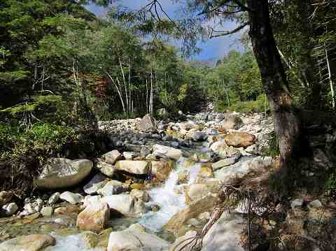登山道はずっと緩やかに登って行きます。 しかし、基本的に沢沿いの道なので、岩や石がゴロゴロした歩きにくい道です。 時に沢をさかのぼり、渡渉を繰り返して登ります。 |