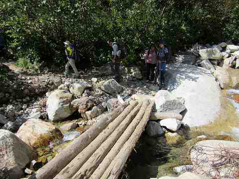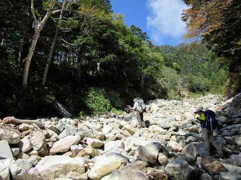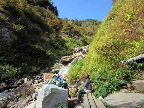 先客が数人休憩しているところが笠原沢でした。 写真右手から流れ込む沢が笠原沢のようです。 ここでは休憩せずに行きます。 〔笠原沢=10:45〕 |