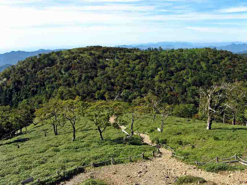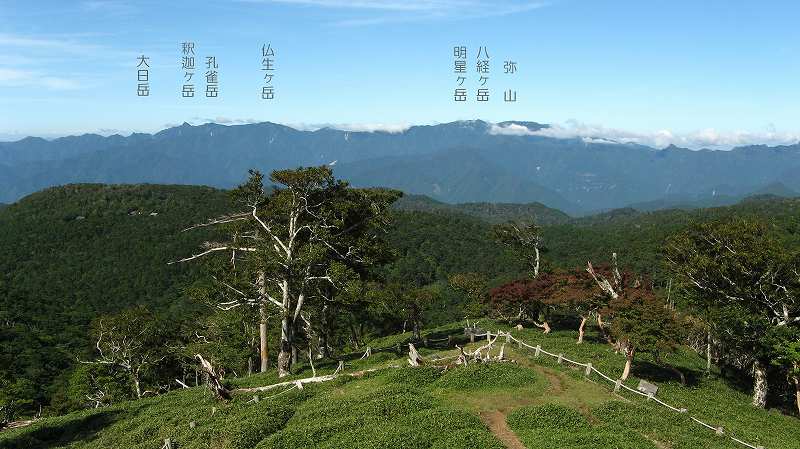 南側の眺望 こちらは南側。すぐ近くに見えるのが正木嶺。 横長の山ですが左の方のピークが正木嶺(1,680m)の山頂ですね。 さあ次の行程、正木嶺に行きましょう。 〔日出ヶ岳山頂 発=9:00〕 |