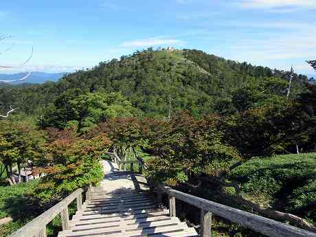 日出ヶ岳を振り返る 正木峠までいったん下って木のトンネルの道を行くとあとは木道階段でした。 途中で振り返ってみたのがこの写真。日出ヶ岳がよく見えます。山頂の展望台も。 |
