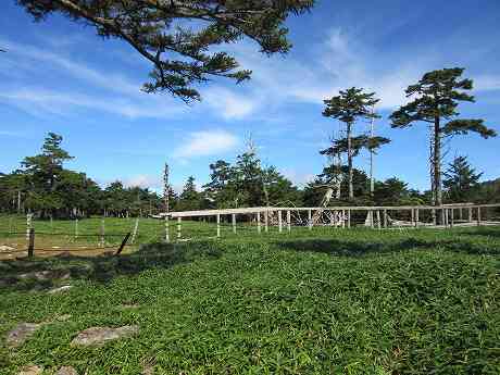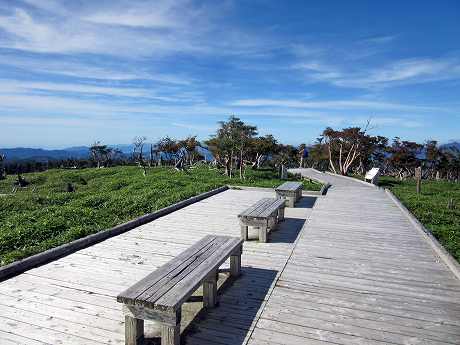 正木嶺の山頂(1,680m) 正木嶺の山頂まで登ってきました。 ミヤコザサの原っぱの中に木道が敷き詰められています。 むかしはここも森だったのでしょうけどね。 〔正木嶺山頂=9:15〕 |