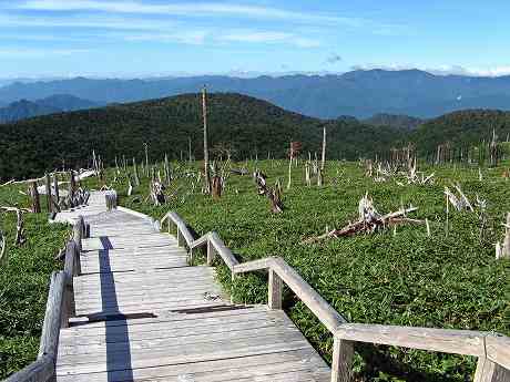 正木嶺から木道を下る 次の正木ヶ原へ行くため木道を下ります。周囲は立ち枯れた木が散立しミヤコザサが地表を覆っています。 説明板によると、むかしは苔むした森だったが、台風などでたくさんの木が倒れ、それを搬出したことを きっかけに林床が乾燥しコケ類が減少してミヤコザサが地表を覆うようになってしまった。とのことです。 |