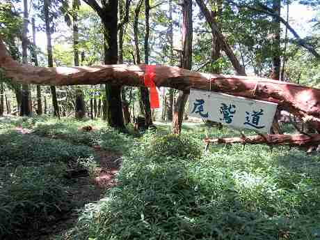 尾鷲道の道標 はじめはいい道でした。 堂倉山まではこのような尾鷲道を示す道標が設置されていて赤テープも各所にあります。 |