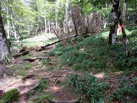 正木ヶ原 笹原から樹林帯に入り、正木ヶ原まできました。 ここも森林破壊が進んできているところです。 〔正木ヶ原=9:35〕 |