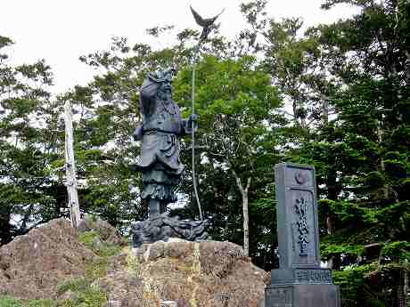 牛石ヶ原の神武天皇像 木道もある道を歩き神武天皇像がある牛石ヶ原まできました。36年前、友人たちと この像に上って撮った写真がアルバムに残っています。 魔物を封じ込めたという伝説の牛石の横を通って大蛇嵓へ向かいます。 〔牛石ヶ原=11:55〕 |