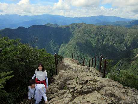 ふどう返しという先鋒が竜口(リュウゴ)尾根と大峰山(奥)を背景に突き天を突いています。 大蛇嵓の先端まで下りないとこの写真は撮れません。滑りにくい岩なので大丈夫ですけどね。 このあと、2人の女性もおっかなびっくりおしりをズリズリして下りてきました。 パンフレットにこの写真があったのでぜひ見たいし、写真に撮りたいと思っていたそうです。 |