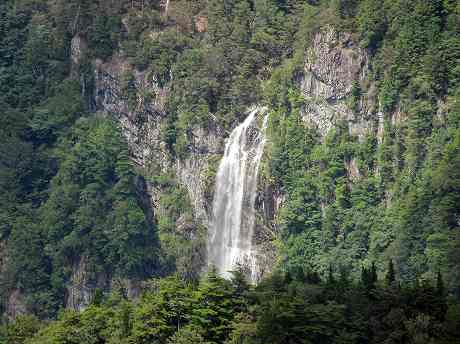 ふどう返しの右奥の西大台に滝が2つ小さく見えます。 その一つをズームアップしました。 中の滝といい落差が250mあるそうです。 もう一つの滝・西ノ滝は中の滝の左下方にあります。 |