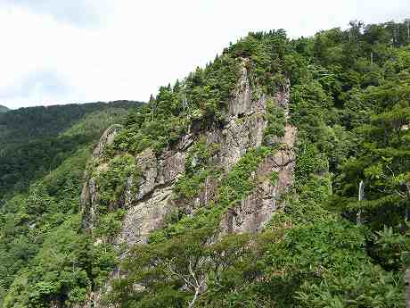 蒸籠蔵(せいろぐら) こちらは大蛇嵓の右手、北側に見える蒸籠蔵です。 この断崖絶壁もみごとですね。 景色を楽しんでいると4・5人のハイカーがやってきたので場所をゆずって戻ることにします。 〔大蛇嵓 発=12:10〕 |