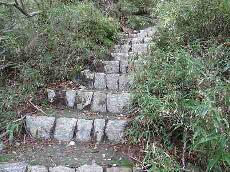 石階段を登る シオカラ谷吊橋をわたるとすぐ急な石階段が待っていました。 結局100mくらい急登でしょう。そのあとも登りをこなします。 |