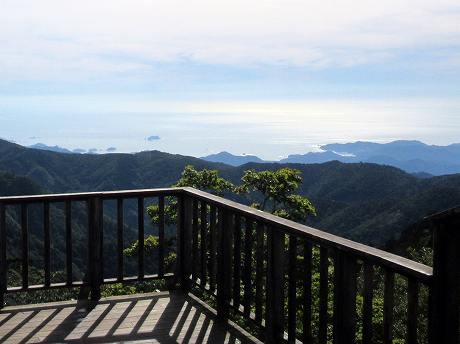 展望台からの眺望 せっかくなので展望台に寄っていきます。 光って見えるのは熊野灘。リアス式海岸の沖に小さな島が点在します。 尾鷲市はこの写真の右手になります。 〔正木峠・展望台 発=8:30〕 |