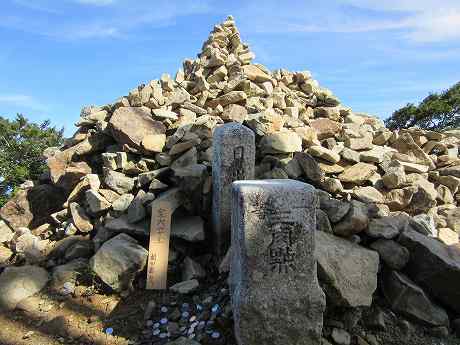 日出ヶ岳山頂三角点 展望台のすぐ北側に日出ヶ岳の山頂三角点(1,695m)がありました。一等三角点ですね。 後ろにはケルンが積み上げられています。 〔日出ヶ岳山頂 着=8:40〕 |