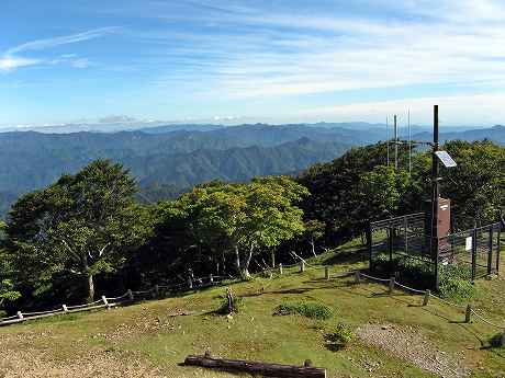 展望台からの眺望・西側 展望台に上ってみましょう。 部分的に雲はありますがすっきりとした青空です。 まずは西側の眺望。 最高峰の八経ヶ岳など大峰の山々が並んでいます。 |
