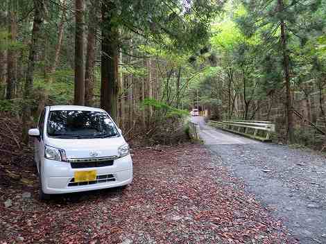 林道ゲート手前の駐車地 林道ゲートがある中河原橋の手前に駐車。 今日は林道工事をするようで、支度している間にも工事の人の車がゲートを開けて 林道を上って行きます。 〔林道ゲート手前駐車地 発=7:30〕 |