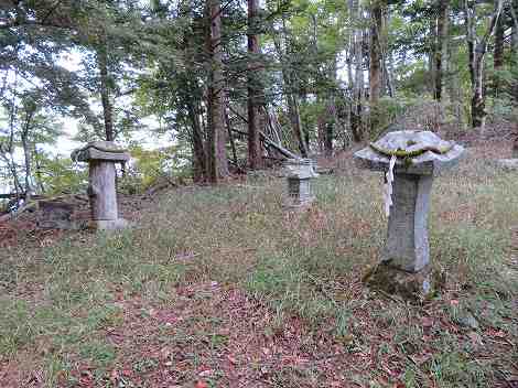 嶺宮跡の石祠 鹿留登山道分岐から山頂方向へちょっと行ったところに嶺神宮と書かれている石祠が立っていました。 かつては倒れた石燈籠や礎石があるだけだったそうです。 |