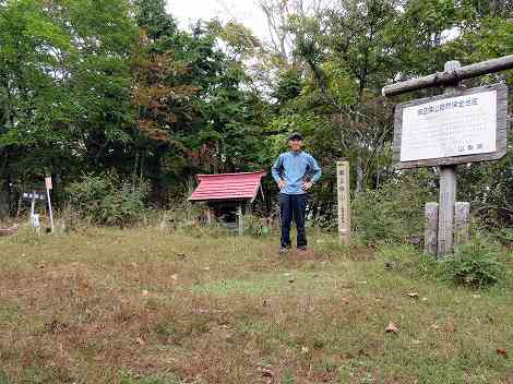 御正体山山頂(1,681m) 鹿留分岐・嶺宮跡から30分、多少アップダウンのある道を登って御正体山山頂に到着。 広い山頂で標識などがたくさん立っているところでした。 写真のように小社があり、大きな一等三角点もあります。 〔御正体山山頂 着=10:10〕 |