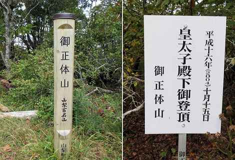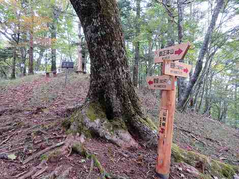 山標など 山標と皇太子殿下の御登頂標。広い山頂の一角に立っています。 周囲は樹木に囲まれていて眺望はないし、誰も登って来ないので早めの昼食をとって下山します 〔御正体山山頂 発=10:35〕 |