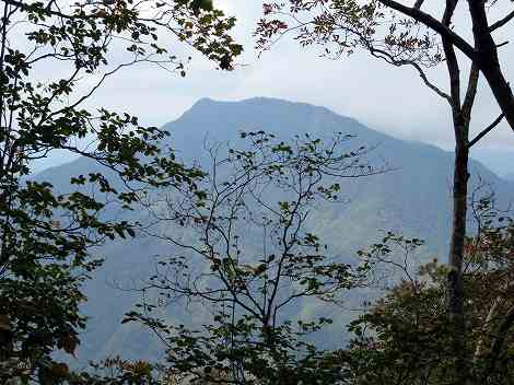 樹間に見る鹿留山 帰り道で展望はないかと探し、西側に見つけた山は鹿留山(1,033m)だと思われます。 |