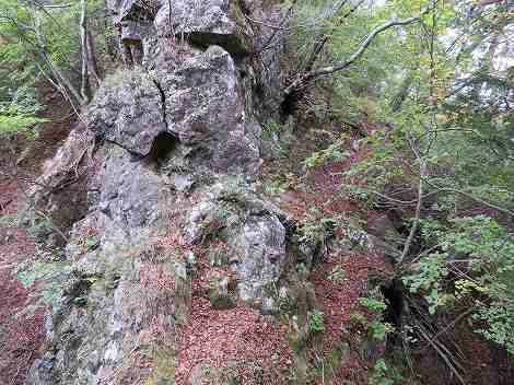 抱付岩 登って行くときも見ながらそばを通っていきましたがこの岩が抱付岩でしょうか。 この大岩の右下を巻いていきます。 |