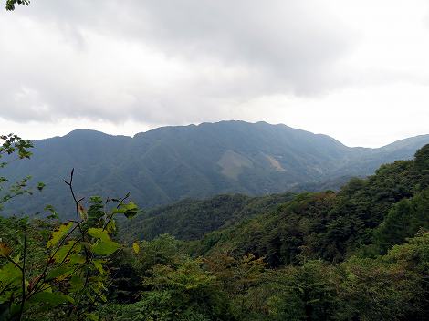 登り口上から東側の展望 登り口のすぐ上まで戻ってきました。 東側に二十六夜山(1,297m)・今倉山(1,470m)、道坂峠などが見えます。 〔登り口 着=11:35〕 |