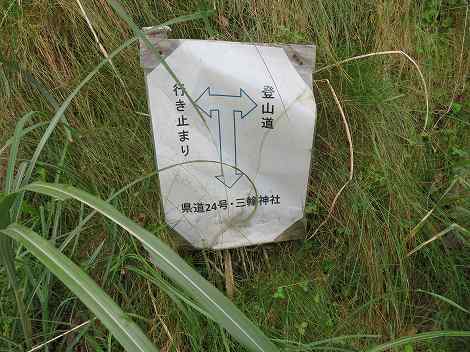 案内表示 ありました、登山道の案内表示。右へ行けということか。 しかし、このあとうっかり右の林道をどんどん進んでしまったのです。 違和感を覚えてGPSを見てわかりました、林道分岐からすぐ近くのところから山道に入るのです。 |