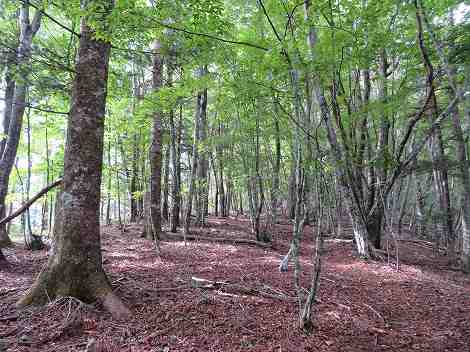 ブナ林を行く 尾根道に取り付くといきなり急登でした。ジグザグに登っていくとやがてなだらかな道に。 優しい感じのブナ林の道に変わりました。 |
