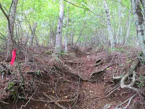 鹿留(ししどめ)登山道分岐 登り口から約75分で鹿留(池の平)登山道分岐まで登ってきました。 あー疲れたー、500mの急登はきつかったー。 平たんになったこの辺り一帯がかつて嶺宮(峰宮・みねみや)があったところでしょう。 〔鹿留登山道分岐 着=9:35〕 |