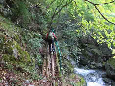 手すり付き丸太橋 橋をわたって川の右岸を20mほど遡上すると左から流れ込む沢に出会います。 そこから左へ急登していくのですが手すり付きの丸太橋がありました。 |