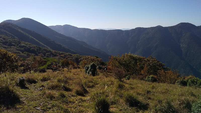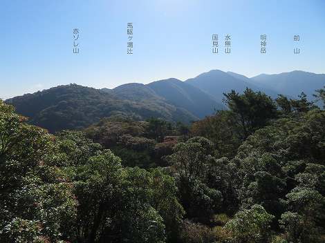 これからたどる稜線 山頂部から展望が広がります。 南側にはこれから行く稜線がしっかり見えますね。 赤ゾレ山、馬駆ヶ場辻、国見山を経て水無山からいったん明神平へ降り、前山に登り返して薊岳まで行く予定です。 こうしてみると遠いなあ。といっていても始まらないので出発します。 〔伊勢辻山山頂 発=8:35〕 |