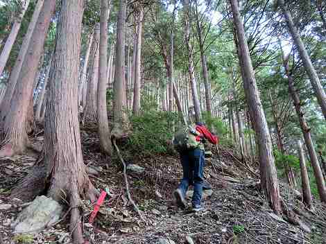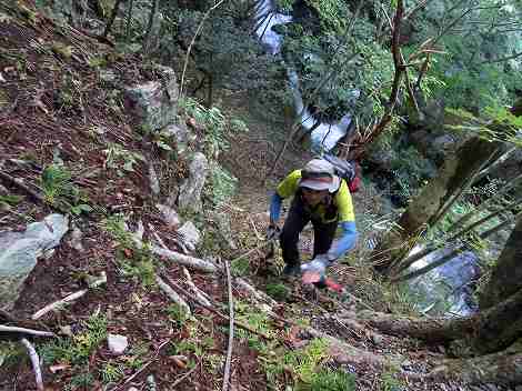 続く急登 ロープをつかんでよじ登った先も急登でした。 結局稜線に出るまで標高差で約550m登ることになりますが、最初の200mくらいが特に急登だったと思います。 |