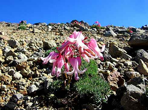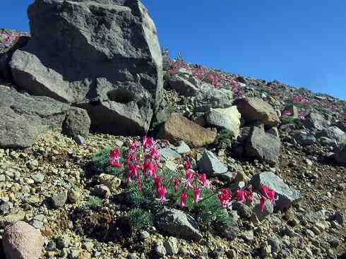 薄いピンクのコマクサも 時期的にはちょっと遅かったようでしぼみかけた花も見かけます。 でも、これだけ咲いていればぜいたくは言えません。 真っ白なコマクサは見つけられませんでしたが、真っ赤な花のほか薄いピンクのものもありました。 |