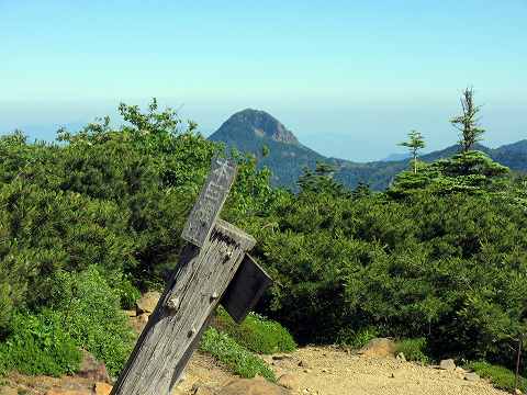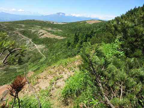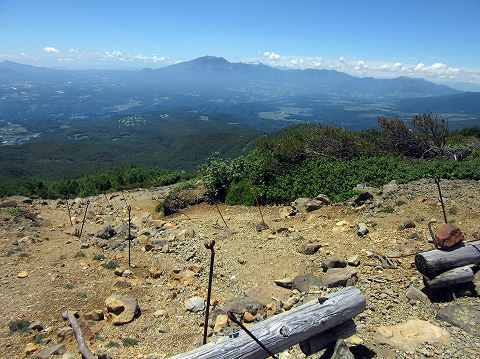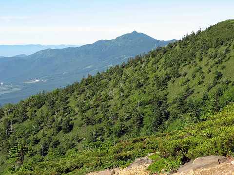 分岐から見る四阿山 久しぶりに出会えた高山に咲く花の女王・コマクサに見とれてなかなか歩が進みませんでしたが 旧火口の縁・遊歩道の分岐まで登ってきました。 登ってくる途中でも見えるところはありましたが、本白根山の左奥に四阿山(2,354m)がよく見えます。 この方角から見るととんがった形をしているんですね。 〔分岐=7:55〕 |