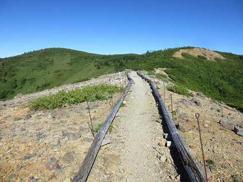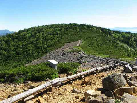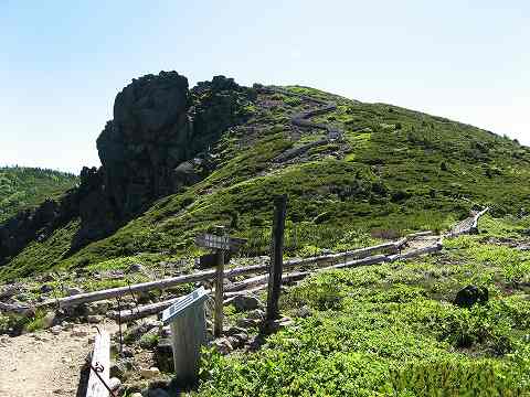 遊歩道最高地点を望む この分岐からまずは本白根山遊歩道の最高地点へ行きます。 遊歩道を行きますが、左の丸い頭が本白根山三角点峰(2,165m)で遊歩道の最高地点はこの右の頭です。 三角点峰は火山性ガスの関係から立ち入り禁止だそうです。 |