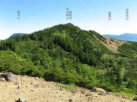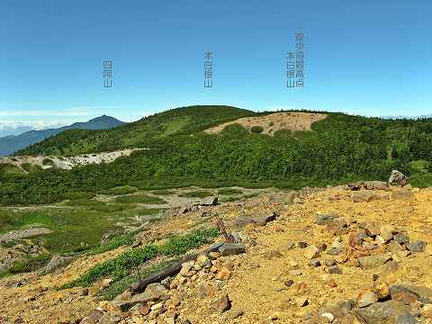 本白根山山頂など 遊歩道最高地点から北側すぐ近くにあとで行く本白根山山頂(2,171m)が見えます。これが草津白根山全体の中で最も高いところになります。 その左奥には横手山、右奥遠くに見えるのは苗場山と佐武流山だと思われます。 さて、次は本白根山展望所へ行きます。 〔遊歩道最高地点 発=8:20〕 |