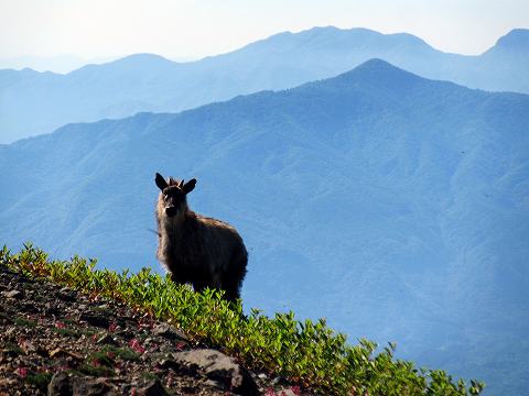 カモシー君現る 展望所へは登ってきた遊歩道を下っていくのですが途中でカモシー君が現れました。 コマクサの花畑の向こうから私を見つめているようですね。 |