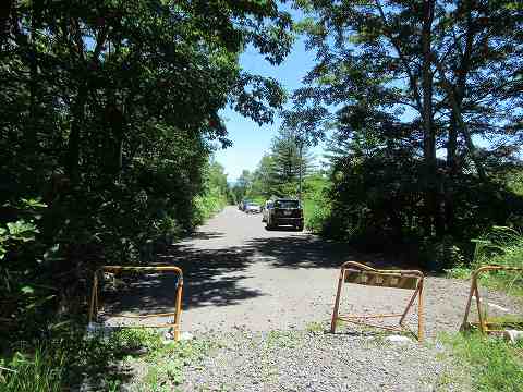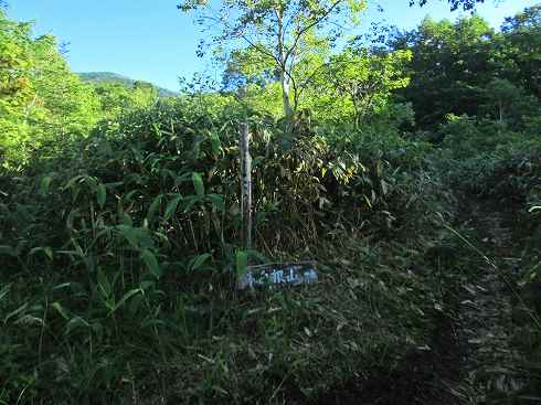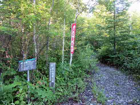 登山口 出発して15分ほど林道を歩いてきました。 林道は左へ続きますが、草津白根山へはこの登山口から入っていきます。 〔登山口=6:10〕 |