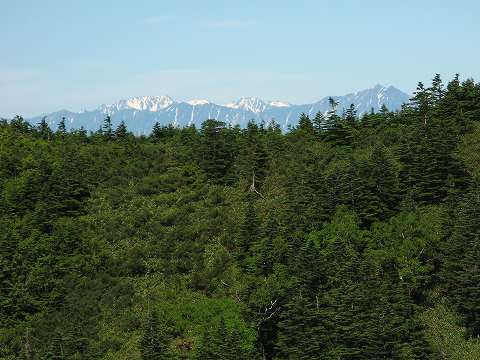 立山・後立山 前の写真の右をよく見ると白い山が見えたので少しズームアップしてみました。 右端の山が鹿島槍ヶ岳なので真ん中が剱岳、左が立山ではないでしょうか。 景色を見ながら休憩し、最後のピーク 2,171mの本白根山山頂・草津白根最高地点へ行くことにします。 〔展望所 発=9:10〕 |