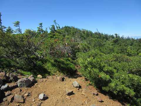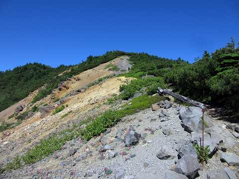山頂へ向けて 展望所から分岐までいったん下り、遊歩道を北の方へ向かいます。ちょうど本白根山の山腹を トラバースするように登り、突き当りから左へ登っていきます。 写真のザレ場をジグザグに登っていき、最上部のヤブを抜けます。左のピークが山頂です。 〔突き当り変曲点=9:25〕 |