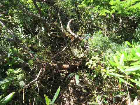 きつい2っ目のヤブ 聞いていた通りきついヤブ漕ぎでした。こうした木の枝を乗り越えて進みます。 まあルートは見えているので問題はありません。 |