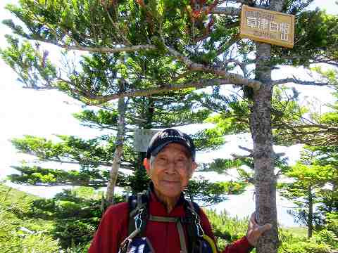 本白根山山頂(2,171m) 何度か間違った方向へ進みましたが、何とか山頂にたどり着きました。 無茶苦茶狭い山頂です。というか山頂もヤブの中です。 私の後から登ってくる人の声が聞こえていたので、そのご夫婦の到着を待って 記念写真を撮ってもらいました。 〔本白根山山頂=9:45~9:55〕 |