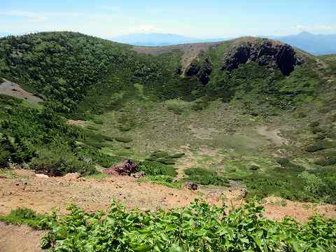 2っ目と1っ目のヤブの間の広場 山頂からの帰りも何度か道迷いしながら2っ目と1っ目のヤブの間の広場まで戻ってきました。 東側には噴火口跡が見下ろせます。3年前に噴火したのは鏡池の方ですがこの火口は古い時代のものでしょうね。 〔ヤブとヤブの間の広場 着=10:05〕 |