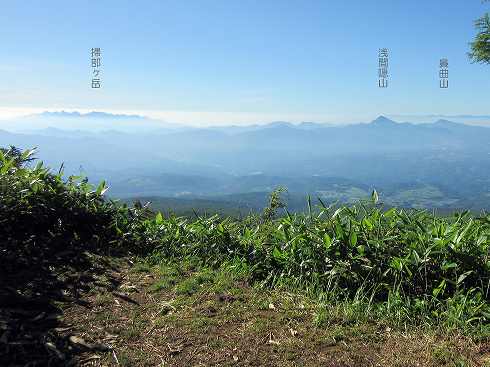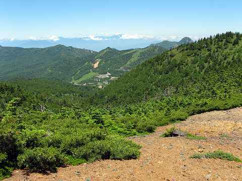 西側の眺望(2,171m) こちらは広場から西側の眺望です。 中央の集落は万座温泉でしょうか。 おなかがすいたのでここでおにぎりタイムを取ってから下山します。 〔ヤブとヤブの間の広場 発=10:20〕 |