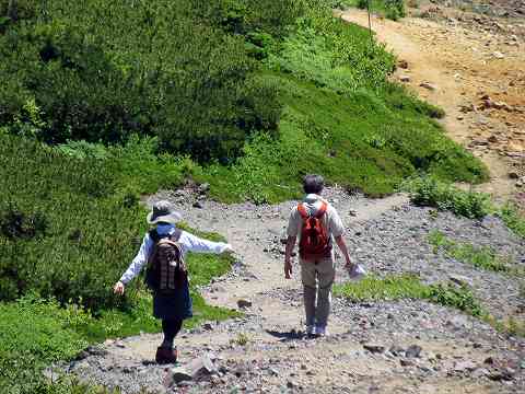 分岐 今朝登ってきた遊歩道分岐まで戻ってきました。 ここでコマクサを眺め、周りの景色をもう一度見ながら休憩したのち下ります。 〔分岐=10:40~10:50〕 |