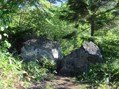 カラマツ台 登山道をふさぐような岩二つ。見ると《山頂 0.75km カラ松台》と書かれていました。ここがカラマツ台ですね。 展望は開けてきていたので小休憩としました。 〔カラマツ台 着=7:05〕 |