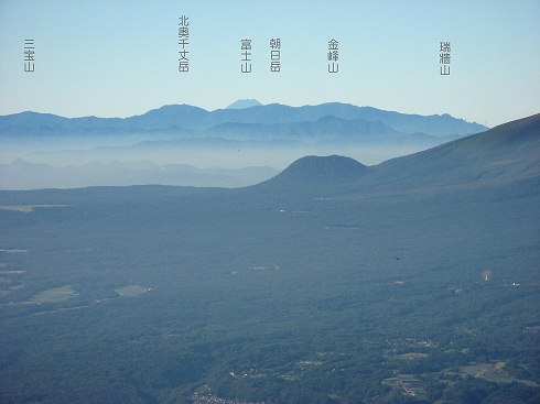 浅間山の左奥に・・・ 前の写真の右ですが浅間山の左奥、雲海に浮かぶ山々の中に見慣れた形をした山を見つけました。 写真ではわかりづらいですが肉眼で富士山だと認識したのです。 |
